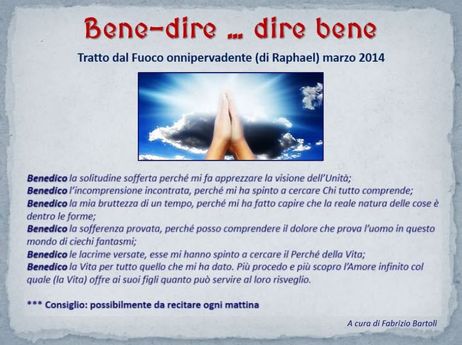BENEDICO la visione sofferta, perché mi fa apprezzare la visione dell'unità. BENEDICO l'incomprensione incontrata, perché mi ha spinto a cercare Chi tutto comprende. BENEDICO la mia bruttezza di un tempo, perché mi ha fatto capire che la reale natura delle cose è dentro le forme. BENEDICO la sofferenza provata, perché posso comprendere il dolore che prova l’uomo in questo mondo di ciechi fantasmi. BENEDICO le lacrime versate, esse mi hanno spinto a cercare il Perché della Vita. BENEDICO la Vita per tutto quello che mi ha dato. Più procedo più scopro l'amore infinito col quale (la Vita) offre ai suoi figli quanto può servire al loro risveglio. 🪔🪔🪔🪔🪔🪔🪔🪔🪔🪔🪔🪔🪔🪔 I PROSSIMI INCONTRI CON IL PROFESSORE FABRIZIO BARTOLI SARANNO INTANTO SABATO 15 NOVEMBRE ALLE ORE 17.00, PRESSO Pilates e Yoga Associazione Liberequilibrio . PARTECIPAZIONE LIBERA E APERTA A CHI VOGLIA AFFRONTARE TALI ARGOMENTI COME : PURIFICARE E CALMARE LA MENTE SECONDO LA TRADIZIONE OCCIDENTALE E ORIENTALE, INCONTRI DI RIFLESSIONE INSIEME. PER ☎️ INFO 339 2996448 ALESSANDRA